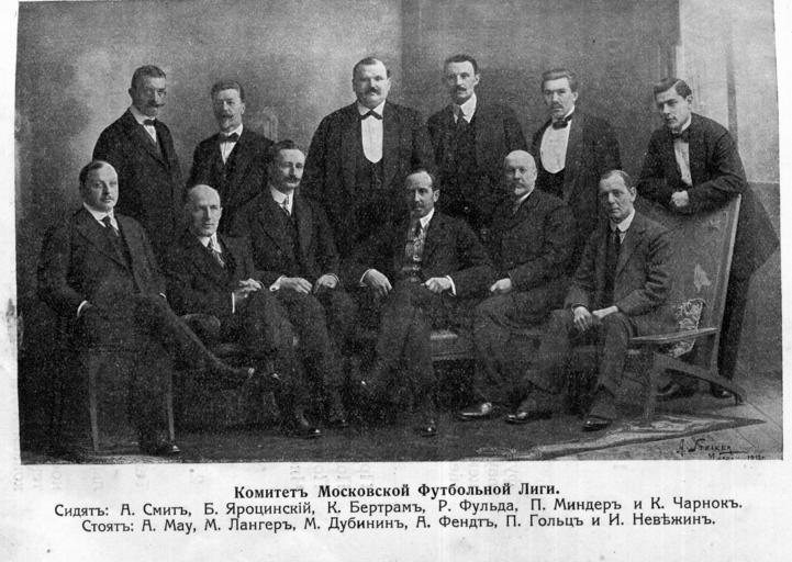 Keywords: MFL Committee 1910.jpg ru Комитет осковской футбольной лиги Сидят А Смит Б Я оцинский К Бе т ам Р Фульда П инде и К Ча нок Стоят А ау Ланге Дубинин А Фендт П Гольц и И евежин Russian illustrated magazine unknown author < 1914 PD-old Association football in the Russian Empire Sportspeople from Russia 1910 in association football