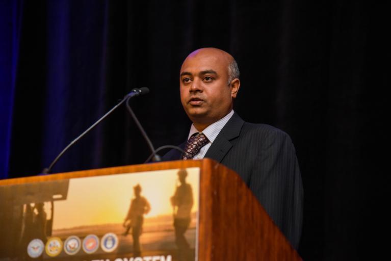 | Keywords: Dr. Srinivas Laxminarayan, Ph.D. at TATRC's BHSAI was awarded 3rd place for his presentation on "Preventing Heat Injuries by Predicting Human Core Temperature" at the MHSRS 2015 Young Investigator Competition. Photo by Melissa Myers, USAMRMC Public Affairs |