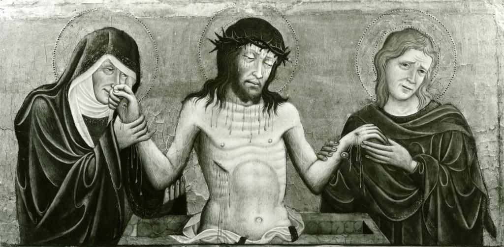 Keywords: Michele di Matteo - Christ as the Man of Sorrows between the Virgin and St John the Evangelist - Walters 37738.jpg Christ is depicted as The Man of Sorrows meaning that he is shown after his death with the wounds from the crucifixion but his eyes are open Because Christ was believed to be both fully human and fully god he continues to suffer for all sinners even after his death He is supported by his mother and the apostle John as he rises from the tomb Michele de Matteo was from Bologna but in the late 1440s he worked in Siena and was influenced by the figural types of Giovanni di Paolo Zeri Italian paintings in the Walters Art Gallery 131 198 ca 1447 1449 Renaissance tempera and gold leaf on panel Painted surface cm 28 4 60 9 ; Panel H 12 x W 24 1/4 x D excluding cradle 3/8 in 30 5 x 61 6 x 1 cm accession number 37 738 17745 Don Marcello Massarenti Collection Rome date and mode of acquisition unknown 1897 catalogue no 73 as Florentine School 14th century Henry Walters city Baltimore Walters Art Museum Henry Walters Acquired by Henry Walters with the Massarenti Collection 1902 The International Style The Arts in Europe Around 1400 The Walters Art Gallery Baltimore 1962 place of origin Siena Italy Walters Art Museum license 2D Italian Renaissance paintings in the Walters Art Museum Michele di Matteo Paintings in the Walters Art Museum Gothic paintings of the Man of Sorrows |