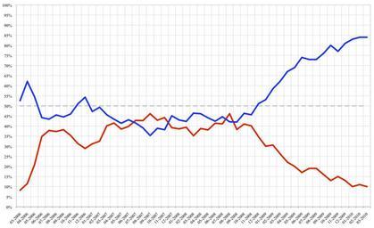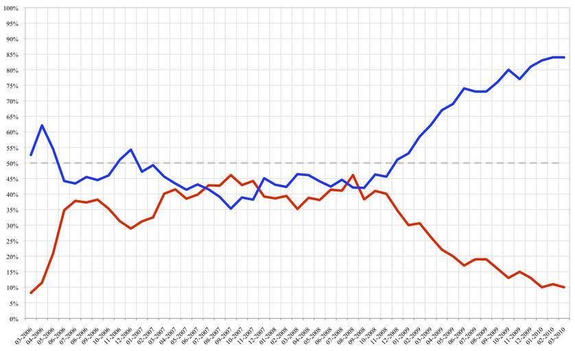 Keywords: Michelle Bachelet approval ratings.png BLUE/AZUL Approval of Bachelet's leadership/Aprueba la conducción de Bachelet<br> RED/ROJO Disapproval/Desaprueba Data source http //www adimark cl Adimark 2006-12-07 own assumed Cantus Michelle Bachelet Approval ratings |