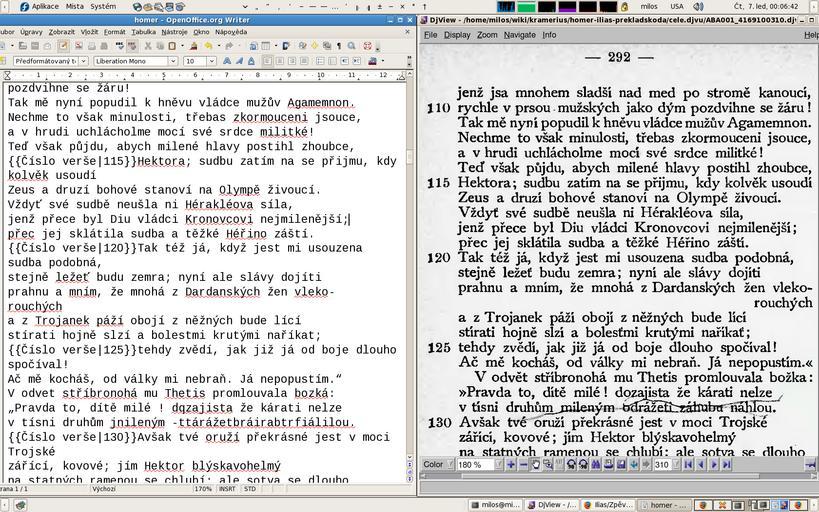 Keywords: Milduv proofreading.png Milda's own proofreading while preparing document 18th book of Homer's Iliad translated by Antonín Škoda here; both ancient Greek original text and Czech translation are PD-old for Czech Wikisource Software used GNU/Linux operating system Fedora distribution Gnome desktop OpenOffice Writer in the left Djview3 in the right Character Palette applet in the top panel for inserting of special characters Mildův vlastní proofreading při přípravě dokumentu zde 18 zpěv Homérovy Iliady; starořecký originál i český překlad Antonína Škody jsou volná díla z důvodu uplynutí ochrany majetkových práv pro české Wikizdroje Použitý software operační systém GNU/Linux distribuce Fedora desktopové prostředí Gnome vlevo OpenOffice org Writer vpravo Djview3 nahoře v panelu aplet Paleta znaků pro rychlé vložení zvláštních znaků screenshot of my desktop User Milda 2010-01-07 Free screenshot GPL PD-old-80 text displayed on desktop Screenshots of free software Screenshots of GNOME Screenshots of text editor software Proofreading Antonín Škoda |