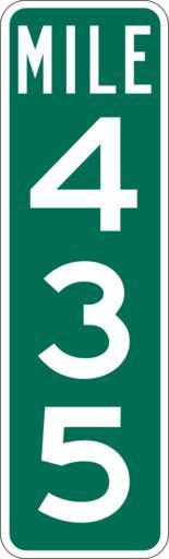 | Keywords: Mile Marker 435.svg PD MUTCD Rfc1394 457 1676 18 60 triple digit mile marker D10-3 Made using Viridian SVG Batcher this file was fabricated by a program 2009-03-05 Paul Robinson Rfc1394 Own work all rights released Public domain D10-3 - Distance Signs-3 Digit |