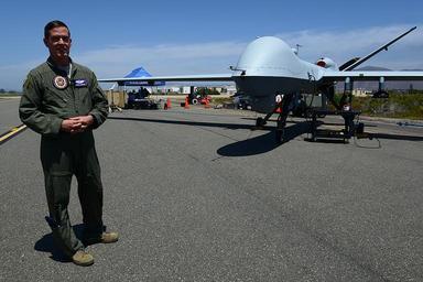 Keywords: Military addresses UAS threat in Black Dart 2015 demonstration 150731-D-BN625-001.jpg en Air Force Maj Scott Gregg Black Dart project officer speaks to the media in front of an MQ-9 unmanned aircraft system at Naval Base Ventura County and Sea Range Point Mugu Calif July 31 2015 The drone Gregg said flies at more than 18 000 feet and weighs more than 1 300 pounds It was being used as part of the two-week Black Dart counter-UAS demonstration July 26 to Aug 1 to assess and improve technologies tactics and techniques used by DoD and its partners DoD News photo by Lisa Ferdinando 2015-07-31 Lisa Ferdinando https //www dvidshub net/image/2099508 150731-D-BN625-001 2015-08-01 12 10 POINT MUGU NAWC CA US 3 PD-USGov Naval Base Ventura County Images from DoD uploaded by Fæ