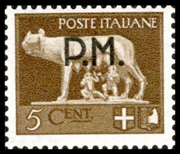 | Keywords: MilitaryStampItaly1943Michel1.jpg ru Ð Ð°Ñ ÐºÐ° полевой почты Италии надпечатка на Ð¼Ð°Ñ ÐºÐµ 1929 года http //www ibolli it/php/em-italia-3516 php Author 1929 / 1943 PD-old 1943 stamps of Italy Capitoline she-wolf on stamps Brown stamps Animals on stamps to be categorised by country |