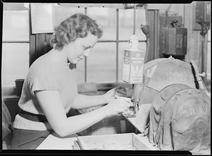 | Keywords: Millville, New Jersey - Glass bottles. A skilled worker at T.C. Wheaton grinding glass stoppers for glass bottles. An... - NARA - 518631.tif Scope and content General notes 518631 Local identifier 69-RP-404 Federal Works Agency Work Projects Administration National Research Project ca 1941 - ca 1942 NARA-Author Hine Lewis Wickes 1874-1940 Photographer 1122914 <br /> Millville Cumberland New Jersey United States North and Central America inhabited place 3354813 39 4 -75 033 <br /> Still Picture Records Section Special Media Archives Services Division NWCS-S National Archives at College Park 8601 Adelphi Road College Park MD 20740-6001 1936 - 1937 Record group Record Group 69 Records of the Work Projects Administration 1922 - 1944 Record group ARC 398 Lewis Hine Photographs for the National Research Project compiled 1936 - 1937 Series ARC 518291 File unit File unit ARC Variant control numbers NAIL Control Number NWDNS-69-RP-404 yes Other versions <gallery> File Millville _New_Jersey_-_Glass_bottles _A_skilled_worker_at_T C _Wheaton_grinding_glass_stoppers_for_glass_bottles _An _-_NARA_-_518631 tif tif File Millville _New_Jersey_-_Glass_bottles _A_skilled_worker_at_T C _Wheaton_grinding_glass_stoppers_for_glass_bottles _An _-_NARA_-_518631 jpg jpg </gallery> NARA-cooperation PD-USGov Millville New Jersey glassworking industry Black and white photographs Black and white photographs of women Women facing right Glass bottles Polishing wheels Women at work in the United States NARA TIF images with categorized JPGs |