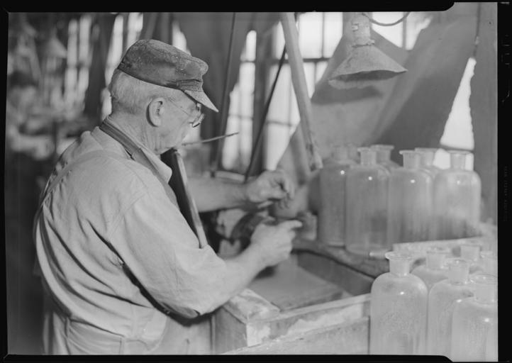 Keywords: Millville, New Jersey - Glass bottles. Stopper-grinder at T. C. Wheaton Co - NARA - 518634.jpg Scope and content Millville New Jersey - Glass bottles Stopper-grinder at T C Wheaton Co This man 83 years old has been working for this factory at this job since he was 15 He is smoothing and shaping stoppers to fit the bottles at the lower right hand corner of the picture With a solution of pumice and water he wets down the emery wheel exactly the shape of the neck of the bottle He whirls the emery wheel by pressing a foot treadle By pressing the stopper of the bottle against this emery wheel he is able to shape it to the required form He is able also to re-shape the neck of the bottle so that stopper and bottle fit together exactly General notes 518634 Local identifier 69-RP-407 Federal Works Agency Work Projects Administration National Research Project ca 1941 - ca 1942 NARA-Author Hine Lewis Wickes 1874-1940 Photographer 1122914 <br /> Millville Cumberland New Jersey United States North and Central America inhabited place 3354813 39 4 -75 033 <br /> Still Picture Records Section Special Media Archives Services Division NWCS-S National Archives at College Park 8601 Adelphi Road College Park MD 20740-6001 1937-03-26 Record group Record Group 69 Records of the Work Projects Administration 1922 - 1944 Record group ARC 398 Lewis Hine Photographs for the National Research Project compiled 1936 - 1937 Series ARC 518291 File unit File unit ARC Variant control numbers NAIL Control Number NWDNS-69-RP-407 Other versions <gallery> File Millville _New_Jersey_-_Glass_bottles _Stopper-grinder_at_T _C _Wheaton_Co_-_NARA_-_518634 tif tif File Millville _New_Jersey_-_Glass_bottles _Stopper-grinder_at_T _C _Wheaton_Co_-_NARA_-_518634 jpg jpg </gallery> NARA-cooperation PD-USGov Millville New Jersey glassworking industry |