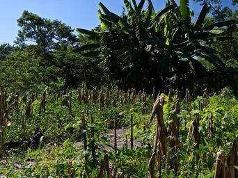 Keywords: Milpa 2011.jpg en A typical Central American Milpa Note the bananas in the background although not native to Central America are commonly found Corn stalks have been bent and left to dry hence the dried cobs and then beans are planted es Una milpa típica en América Central own Ll1324 2011-11-13 Cc-zero Nature of Central America Maize fields |
