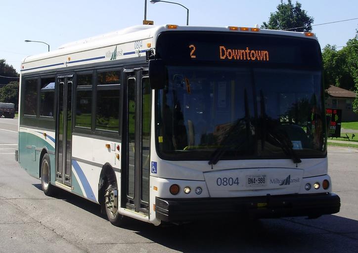 Keywords: Milton Transit Bus 0804.jpg en Milton Transit bus 0804 a Holland Bus Company Blue Bird LF model travelling north on Ontario Street South in Milton Ontario Canada serving the 2 Downtown route Own GTD Aquitaine 2008-08-01 Milton Transit