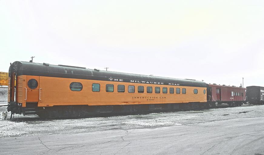<b>A Roger Puta Photograph</b> milwaukeeroad MILW Instruction Car X-5002 and combine in Bensenville, Illinois Yards in March 1985 (29660300662).jpg en MILW X5002 started life as the <i>Cannon Falls</i> a coach-touralux built by the Milwaukee Shops in 1947 It was concverted to coach 554 in 1952 After several renumberings it became the X5002 in 1971 <br> The second car started out as one of the 8 branchline combines built by the Milwaukee shops in 1934 A number of these ended up in MOW service <br> Thanks to kevink for the above information <br> <b>A Roger Puta Photograph</b> 2016-09-18 13 19 59 https //www flickr com/people/129679309 N05 railfan 44 https //www flickr com/photos/129679309 N05/29660300662/ User Fæ/Flickr API Puta's Midwestern Railroad Photographs Interesting Train Cars NO ENGINES OR MOW Railroading in Illinois Chicago Area Railfans Milwaukee Road Mel Finzer RogerPuta Photographs by Roger Puta Photos uploaded from Flickr by Fæ using a script 1971 in rail transport in the United States Chicago Milwaukee St Paul and Pacific Railroad March 1971 in the United States 1985 in rail transport in the United States |