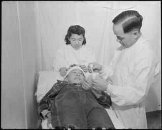 Keywords: Minidoka Relocation Center. Doctor Robert H. Shiomi, Miyoko Shitamae, nurse, Jimmie Shimizu, patien . . . - NARA - 536596.tif Scope and content The full caption for this photograph reads Minidoka Relocation Center Doctor Robert H Shiomi Miyoko Shitamae nurse Jimmie Shimizu patient Hospital Series Scene in out patients clinic where Jimmie had an injured thumb repaired General notes 536596 Local identifier 210-G-A792 Department of the Interior War Relocation Authority 02/16/1944 - 06/30/1946 NARA-Author Stewart Francis War Relocation Authority photographer Photographer 8464475 <br /> Still Picture Records Section Special Media Archives Services Division NWCS-S National Archives at College Park 8601 Adelphi Road College Park MD 20740-6001 1942-12-10 Record group Record Group 210 Records of the War Relocation Authority 1941 - 1989 Record group ARC 537 Central Photographic File of the War Relocation Authority compiled 1942 - 1945 Series ARC 536000 File unit File unit ARC Variant control numbers NAIL Control Number NWDNS-210-G-A792 yes Other versions <gallery> File Minidoka_Relocation_Center _Doctor_Robert_H _Shiomi _Miyoko_Shitamae _nurse _Jimmie_Shimizu _patien_ _ _ _-_NARA_-_536596 tif tif File Minidoka_Relocation_Center _Doctor_Robert_H _Shiomi _Miyoko_Shitamae _nurse _Jimmie_Shimizu _patien_ _ _ _-_NARA_-_536596 jpg jpg </gallery> NARA-cooperation PD-USGov Minidoka National Historic Site NARA TIF images with categorized JPGs |