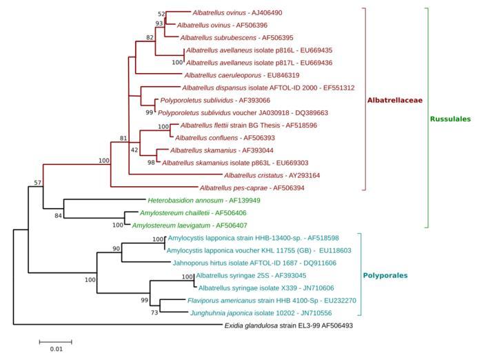 | Keywords: Minimum Evolution-Tree Allbatrellaceae 25S-RNA.svg Evolutionary relationships of Albatrellaceae<br/> Figure Evolutionary relationships of taxa The evolutionary history was inferred using the Minimum Evolution method on the partial 25S rRNA gene The optimal tree with the sum of branch length 0 41327526 is shown The percentage of replicate trees in which the associated taxa clustered together in the bootstrap test 1000 replicates are shown next to the branches The tree is drawn to scale with branch lengths in the same units as those of the evolutionary distances used to infer the phylogenetic tree The evolutionary distances were computed using the Maximum Composite Likelihood method and are in the units of the number of base substitutions per site The ME tree was searched using the Close-Neighbor-Interchange CNI algorithm at a search level of 1 The Neighbor-joining algorithm was used to generate the initial tree The analysis involved 26 nucleotide sequences All positions with less than 95 site coverage were eliminated That is fewer than 5 alignment gaps missing data and ambiguous bases were allowed at any position There were a total of 863 positions in the final dataset Evolutionary analyses were conducted in MEGA5 Evolutionary analyses were conducted in MEGA5 Exidia glandulosa strain EL3-99 AF506493 was used as outgroup All sequences were obtained from the Genbank and were aligned by the CustalW algorithm with standard settings <br/> List of the GenBank Sequences http //www ncbi nlm nih gov/nuccore/AF393045 Albatrellus syringae 25S AF393045 http //www ncbi nlm nih gov/nuccore/EU669435 Albatrellus_avellaneus_isolate_p816L - EU669436 http //www ncbi nlm nih gov/nuccore/EU669436 Albatrellus_avellaneus_isolate_p817L - EU669436 http //www ncbi nlm nih gov/nuccore/EU846319 Albatrellus_caeruleoporus - EU846319 http //www ncbi nlm nih gov/nuccore/AF506393 Albatrellus_confluens - AF506393 http //www ncbi nlm nih gov/nuccore/AY293164 Albatrellus_cristatus - AY293164 http //www ncbi nlm nih gov/nuccore/EF551312 Albatrellus_dispansus_isolate_AFTOL-ID_2000 - EF551312 http //www ncbi nlm nih gov/nuccore/AF518596 Albatrellus_flettii_strain_BG_Thesis - AF518596 http //www ncbi nlm nih gov/nuccore/AF506396 Albatrellus_ovinus - AF506396 http //www ncbi nlm nih gov/nuccore/AJ406490 Albatrellus_ovinus - AJ406490 http //www ncbi nlm nih gov/nuccore/AF506394 Albatrellus_pes-caprae - AF506394 http //www ncbi nlm nih gov/nuccore/AF393044 Albatrellus_skamanius - AF393044 http //www ncbi nlm nih gov/nuccore/EU669303 Albatrellus_skamanius_isolate_p863L - EU669303 http //www ncbi nlm nih gov/nuccore/AF506395 Albatrellus_subrubescens - AF506395 http //www ncbi nlm nih gov/nuccore/JN710606 Albatrellus_syringae_isolate_X339 - JN710606 http //www ncbi nlm nih gov/nuccore/AF518598 Amylocystis lapponica strain HHB-13400-sp - AF518598 http //www ncbi nlm nih gov/nuccore/EU118603 Amylocystis lapponica voucher KHL 11755 GB - EU118603 http //www ncbi nlm nih gov/nuccore/AF506406 Amylostereum chailletii - AF506406 http //www ncbi nlm nih gov/nuccore/AF506407 Amylostereum laevigatum - AF506407 http //www ncbi nlm nih gov/nuccore/AF506493 Exidia glandulosa strain EL3-99 - AF506493 http //www ncbi nlm nih gov/nuccore/EU232270 Flaviporus americanus strain HHB 4100-Sp - EU232270 http //www ncbi nlm nih gov/nuccore/AF139949 Heterobasidion annosum AF139949 http //www ncbi nlm nih gov/nuccore/DQ911606 Jahnoporus_hirtus_isolate_AFTOL-ID_1687 - DQ911606 http //www ncbi nlm nih gov/nuccore/JN710556 Junghuhnia japonica isolate 10202 - JN710556 http //www ncbi nlm nih gov/nuccore/AF393066 Polyporoletus_sublividus - AF393066 http //www ncbi nlm nih gov/nuccore/DQ389663 Polyporoletus_sublividus_voucher_JA030918 - DQ389663 own 2014-06-13 User Thkgk Cc-zero Albatrellaceae Cc-zero |