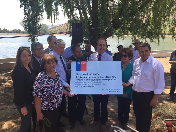 | Keywords: outdoor Paine, jueves 24 de noviembre de 2016.- El Ministro de Obras Públicas, Alberto Undurraga, y el Ministro de Agricultura, Carlos Furche, encabezaron hoy la ceremonia de inauguración del nuevo Embalse de Riego Hospital en la comuna de Paine, obra que forma parte del Plan Nacional de Construcción y Rehabilitación Pequeños Embalses del Ministerio de Obras Públicas.  El Ministro Alberto Undurraga destacó que “estas obras son muy importantes por su funcionalidad para dar un mejor uso al agua y también para mejorar la calidad de vida y oportunidades de desarrollo de los habitantes de la comuna de Paine”.  “Estamos haciendo otros 24 pequeños embalses como este en distintos lugares de nuestro país y dejaremos otros 8 grandes embalses en licitación o construcción, con ello durante el Gobierno de la Presidenta Bachelet, estaremos construyendo más infraestructura para el agua que nunca en la historia de Chile”, explicó el Secretario de Estado.  Por su parte, el Ministro de Agricultura, Carlos Furche, manifestó que "esto es muy importante para quienes son beneficiarios directos, más de 1.000 pequeños productores que van a aumentar su capacidad productiva, de frutas y hortalizas que abastecen además a la región Metropolitana".  Además, el titular del Agro agregó que esto tiene una importancia que va un poco más allá de haber cumplido a tiempo un compromiso que tomaron hace un año con los dirigentes de esta comunidad, porque permite mostrar que es posible avanzar simultáneamente en la entrega de obras como estas y en la modificación del marco regulatorio.   "Ambas cosas se pueden hacer en simultáneo y es lo que estamos haciendo. De manera que esto es una buena noticia para los productores y es un ejemplo de lo que estamos haciendo en todo Chile. Tranques como estos estamos entregando casi todos los meses a lo largo del país", explicó.  En la oportunidad, la Secretaria Ejecutiva de la Comisión Nacional de Riego (CNR), María Loreto Mery, destacó que “en materia de planificación del riego estamos trabajando muy de la mano con el Ministro de Obras Públicas, ya que estamos viendo las distintas necesidades multipropósito del recurso hídrico. Algunos de los embalses que estamos rehabilitando no son sólo para riego, sino también para agua potable rural o contribuir ante hechos de emergencia como un incendio forestal”.  El nuevo Embalse Hospital permitirá entregar una capacidad de almacenamiento de 200.000 m3, que permitirán a 1.200 pequeños agricultores el riego de más de 2.000 hectáreas de terrenos, principalmente cultivos de frutas y verduras.  Las obras, que fueron ejecutadas por el Ministerio de Obras Públicas, a través de su Dirección de Obras Hidráulicas, representaron una inversión de 484 millones de pesos, destacando el retiro de 70.000 m3 de sedimento, el revestimiento en hormigón de 300 metros del canal alimentador que trae las aguas del Río Angostura, el recambio de las 6 compuertas, la construcción de un desarenador y un vertedero para evacuación de crecidas.  El Plan de Construcción y Rehabilitación Pequeños Embalses contempla la intervención de 25 embalses, de ellos 8 rehabilitaciones se encuentran terminadas, se trata de los embalses Chada y Hospital en Paine; Los Molles de Melipilla; Santa Rosa en Limache; El Principal de Pirque; Rautén Bajo en Quillota; Santa Julieta y Concepción en Ovalle. Además, de otros 2 en ejecución: Huechún en Melipilla y San Antonio en Ovalle. En paralelo, se encuentra en construcción el Embalse Empedrado en la Región del Maule y en estudio 24 sitios, entre las regiones de Coquimbo y La Araucanía, para construir nuevos pequeños embalses. Durante la ceremonia de inauguración del nuevo Embalse Hospital también participaron el Director General de Aguas, Carlos Estévez; el Director Nacional de Obras Hidráulicas, Reinaldo Fuentealba; la Secretaria Ejecutiva de la CNR, Loreto Mery; el Gobernador de la Provincia del Maipo, Felipe Jeldres y el Presidente de la Comunidad de Aguas del Canal Hospital, Víctor Catalán.  Paine, jueves 24 de noviembre de 2016.- El Ministro de Obras Públicas, Alberto Undurraga, y el Ministro de Agricultura, Carlos Furche, encabezaron hoy la ceremonia de inauguración del nuevo Embalse de Riego Hospital en la comuna de Paine, obra que forma parte del Plan Nacional de Construcción y Rehabilitación Pequeños Embalses del Ministerio de Obras Públicas.  El Ministro Alberto Undurraga destacó que “estas obras son muy importantes por su funcionalidad para dar un mejor uso al agua y también para mejorar la calidad de vida y oportunidades de desarrollo de los habitantes de la comuna de Paine”.  “Estamos haciendo otros 24 pequeños embalses como este en distintos lugares de nuestro país y dejaremos otros 8 grandes embalses en licitación o construcción, con ello durante el Gobierno de la Presidenta Bachelet, estaremos construyendo más infraestructura para el agua que nunca en la historia de Chile”, explicó el Secretario de Estado.  Por su parte, el Ministro de Agricultura, Carlos Furche, manifestó que "esto es muy importante para quienes son beneficiarios directos, más de 1.000 pequeños productores que van a aumentar su capacidad productiva, de frutas y hortalizas que abastecen además a la región Metropolitana".  Además, el titular del Agro agregó que esto tiene una importancia que va un poco más allá de haber cumplido a tiempo un compromiso que tomaron hace un año con los dirigentes de esta comunidad, porque permite mostrar que es posible avanzar simultáneamente en la entrega de obras como estas y en la modificación del marco regulatorio.   "Ambas cosas se pueden hacer en simultáneo y es lo que estamos haciendo. De manera que esto es una buena noticia para los productores y es un ejemplo de lo que estamos haciendo en todo Chile. Tranques como estos estamos entregando casi todos los meses a lo largo del país", explicó.  En la opo