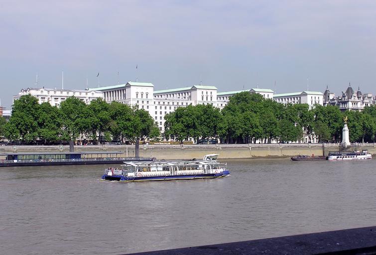 Keywords: Ministry.of.defence.london.arp.jpg The Ministry of Defence Whitehall London England seen from the River Thames <br> On the far right on the river is the golden RAF Memorial <br> Also on the far right are the grey turrets of Whitehall Court an apartment block including a 280 room hotel <br> Photographed by Adrian Pingstone in June 2005 and placed in the public domain Arpingstone Ministry of Defence Main Building London River Services boats Tour boats on the Thames in London Taken with Olympus C-750UZ Westminster Millennium Pier London |