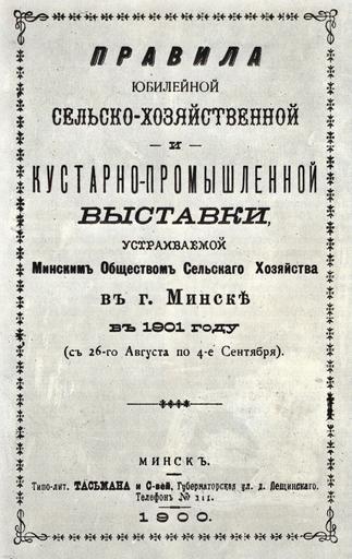 Keywords: Minsk Society of Agriculture jubilee - 1900 AD.jpg en The cover of the book Rules of the jubilee agricultural and handicraft industrial exhibition organized by the Minsk society of agriculture Minsk city Russian Empire 1900 AD ru Обложка книги П авила юбилейной сельско-хозяйственной и куста но-п омышленной выставки уст аиваемой инским обществом сельского хозяйства г инск Российская импе ия 1900 г be Вокладка кнігі П авілы юбілейнай сельска-гаспада чай і саматужна-п амысловай выстаўкі ладжанай інскім тава ыствам сельскай гаспада кі г інск Расійская імпе ыя 1900 г a reproduction from the book Шыбека З В инскъ сто гадоў таму / З В Шыбека інск Бела усь 2007 304 с Minsk Society of Agriculture Rissian empire 1900 Minsk Society of Agriculture PD-old |
