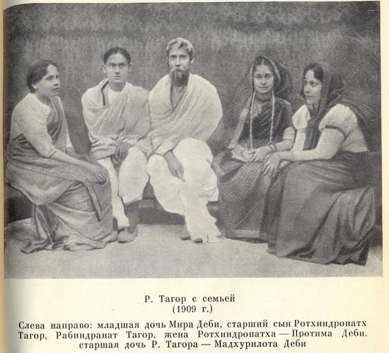 | Keywords: Mira Devi, Rathindranath Tagore, Rabindranath Tagore, Pratima Devi, Madhurilata Devi.jpg Rabindranath Tagore with family Left to right youngest daughter Mira Devi eldest son Rathindranath Tagore Rabindranath Tagore wife of Rathindranath Protima Devi eldest daughter of R Tagore Madhurilata Devi Рабинд анат Таго с семьей Слева нап аво младшая дочь и а Деви Деби ста ший сын Ратхинд анатх Таго Рабинд анат Таго жена Ратхинд анатха П отима Деви Деби ста шая дочь Р Таго а адху илата Деви Деби ru Рабинд анат Таго Соб ание сочинений / Под ед Е Быковой А Гнатюка-Данильчука В овиковой Госуда ственное издательство художественной лите ату ы 1961 en Rabindranath Tagore Collected works / Ed by IE Bykova A Gnatyuk-Danilchuk V Novikova Moscow State publishing house of fiction 1961 1909 Author PD-old Rabindranath Tagore in 1909 Rabindranath Tagore's family |