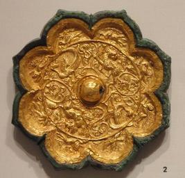 | Keywords: Mirror with Foliate Rim and Inset Gold Plaque, 8th century, Tang dynasty, China, cast bronze with gold inset - Sackler Museum - DSC02599.JPG Exhibit in the Sackler Museum Harvard University Cambridge Massachusetts USA The museum permitted photography of this artwork without restriction This artwork is in the public domain because the artist died more than 70 years ago Daderot 2012-11-17 12 43 08 Daderot cc0 cc0 Chinese metalwork in the Sackler Museum Bronze mirrors of the Tang Dynasty | ||||