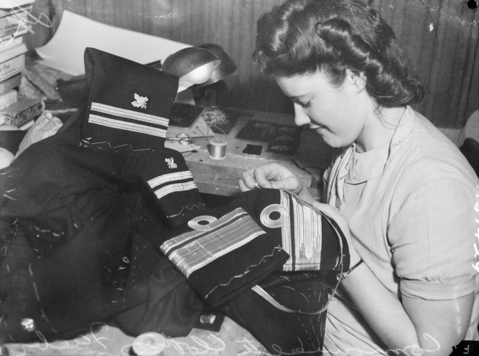 | Keywords: australian war memorial australianwarmemorial sewing blackandwhite monochrome indoor black and white ID number: 139429 Photographer: Herald Newspaper Place made: Melbourne, Victoria Date made: 10 August 1943 Miss Winifred Yates, an employee of the Commonwealth Clothing Factory, stitching gold bullion braid on naval uniforms. Rights information: No known copyright restrictions. This photograph is from the Australian War Memorial's collection www.awm.gov.au Persistent URL: cas.awm.gov.au/item/139429 ID number: 139429 Photographer: Herald Newspaper Place made: Melbourne, Victoria Date made: 10 August 1943 Miss Winifred Yates, an employee of the Commonwealth Clothing Factory, stitching gold bullion braid on naval uniforms. Rights information: No known copyright restrictions. This photograph is from the Australian War Memorial's collection www.awm.gov.au Persistent URL: cas.awm.gov.au/item/139429 |