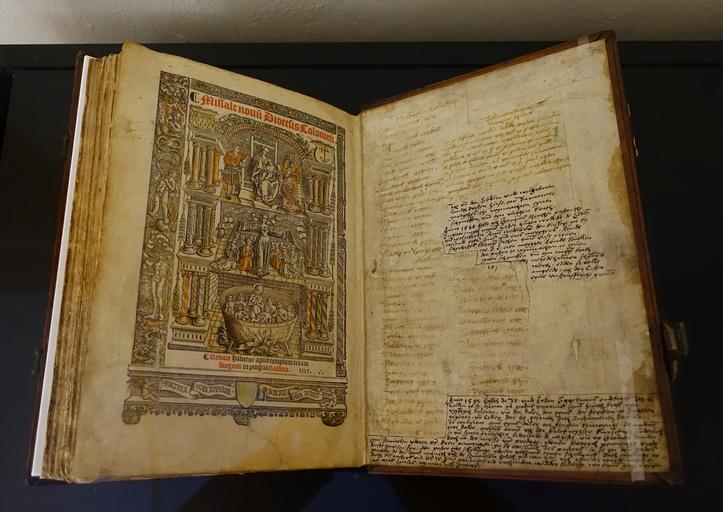 Keywords: Missal, printed in Paris, 1525, publisher Franz Brinckmann, Cologne, paper in leather binding - Museum Schnütgen - Cologne, Germany - DSC00220.jpg en Exhibit in the Museum Schnütgen - Cologne Germany 2015-11-29 09 03 32 own Daderot other versions PD-old-100 cc-zero Books in the Museum Schnütgen