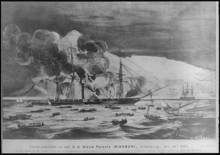 Keywords: Missouri, starboard side, burning at Gibraltar Aug. 26, 1843, 08-26-1843 - NARA - 512997.jpg Scope and content The Mississippi a 10-gun side-wheel steamer was commissioned in 1841 General notes 512997 Local identifier 19-N-13271 Still Picture Records Section Special Media Archives Services Division NWCS-S National Archives at College Park 8601 Adelphi Road College Park MD 20740-6001 1843-08-26 Record group Record Group 19 Records of the Bureau of Ships 1940 - 1966 Record group ARC 348 Naval History Photographs Bureau of Ships compiled 1883 - 1941 Series ARC 512919 File unit File unit ARC Variant control numbers NAIL Control Number NWDNS-19-N-13271<br /> Select List Identifier NAVY SHIPS 25 Other versions <gallery> File Missouri _starboard_side _burning_at_Gibraltar_Aug _26 _1843 _08-26-1843_-_NARA_-_512997 tif tif File Missouri _starboard_side _burning_at_Gibraltar_Aug _26 _1843 _08-26-1843_-_NARA_-_512997 jpg jpg </gallery> NARA-cooperation PD-USGov Art of the United States USS Missouri ship 1841 Gibraltar in the 1840s |