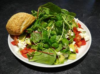 Keywords: mixed salad sesame seed bun tomato paprika feta cheese avocado healthy