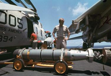 Keywords: MK 46 torpedo for HS-15 SH-3H on CV-66 1977.JPEG A U S Navy ordnance officer inspects a Mark 46 torpedo on an Aero 21A weapons skid being loaded aboard a Sikorsky SH-3H Sea King helicopter BuNo 149894 from Helicopter Anti-Submarine Squadron HS-15 Red Lions parked on the flight deck of the aircraft carrier USS America CV-66 on 1 September 1977 HS-15 was assigned to Carrier Air Wing 6 CVW-6 for a deployment to the Mediterranean Sea from 29 September 1977 to 25 April 1978 <br> The SH-3H 149894 was later featured in the movie Top Gun as the helicopter that lands with the two men shot down by the hero It was finally retired to the AMARC as 9H0059 on 17 December 1993 http //www defenseimagery mil U S DefenseImagery photo VIRIN http //www dodmedia osd mil/DVIC_View/Still_Details cfm SDAN DNST8800761 JPGPath /Assets/1986/Navy/DN-ST-88-00761 JPG DN-ST-88-00761 1977-09-01 USN PD-USGov-Military-Navy Mark 46 torpedo SH-3H Sea King Aboard USS America CV-66 |