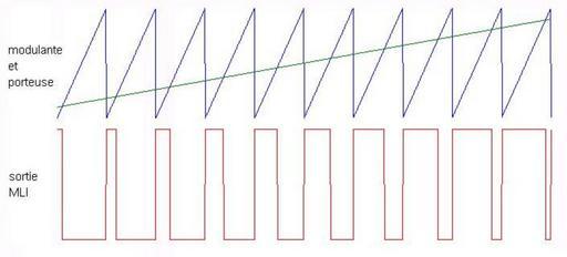 Keywords: MLI2.jpg Modulation de largeur d'impulsion MLI à porteuse en dent de scie alignée à droite Right-aligned Pulse Width Modulation Own 2006-01-25 ArséniureDeGallium PD Power electronic diagrams Pulse width modulation