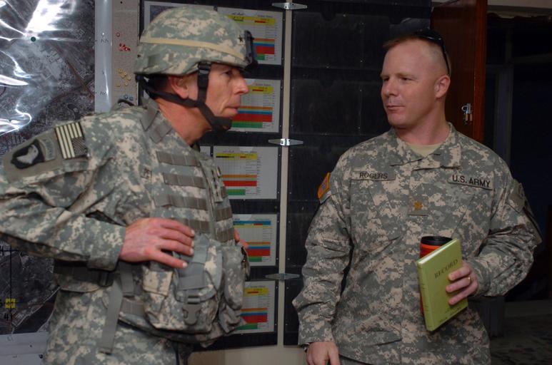 | Keywords: MNF-I commander visits JSS Mansour DVIDS40227.jpg  en Gen David H Petraeus commander of Multi-National Forces - Iraq meets with Tucaipa Calif native Maj Chris Rogers 38 the communications officer for Headquarters and Headquarters Company 1st Battalion 5th Cavalry Regiment 2nd Brigade Combat Team 1st Cavalry Division at Joint Security Station JSS Mansour in the Jamia neighborhood of the Mansour district of Baghdad March 28 Petraeus visited to see the progress troops are making in standing up and fortifying the JSS 2007-03-28 Spc Leith Edgar https //www dvidshub net/image/40227 40227 2007-04-02 17 59 BAGHDAD IQ PD-USGov David Petraeus 1st Cavalry Division United States Images from DoD uploaded by Fæ |