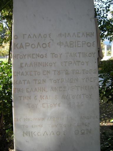 | Keywords: Mnimeio favierou palataki haidari.JPG el Το νημείο Κάρολου Φαβιέρου είναι ίσως το αλιότερο μνημείο του Χαϊδαρίου αφού φιλοτεχνήθηκε με ρωτοβουλία του ικολάου Θων ρος τιμήν του φιλέλληνα Κάρολου Φαβιέρου για την συμβολή του στις μάχες του Χαϊδαρίου στις 6 και 8 Αυγούστου 1821 Σήμερα η ροτομή είναι α οκομμένη α ό την μαρμάρινη στήλη η ο οία συνεχίζει να κοσμεί τον ερίβολο της έ αυλης Παλατάκι μ ροστά α ό το αναψυκτήριο «Ιστορικόν» Το στηθαίο του μνημείου βρίσκεται σήμερα στην αίθουσα Δημοτικού Συμβουλίου στο νέο Δημαρχείο αφού υ έστη εργασίες συντήρησης ΦΩΤΟΓΡΑΦΙΑ ΔΗ ΟΣ ΧΑΪΔΑΡΙΟΥ ΑΓ ΩΣΤΗ Cc-zero Uncategorized 2014 April 23 Κατηγορία Χαϊδάρι |