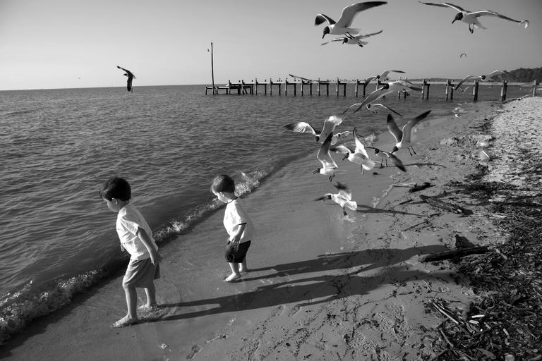 Keywords: mobile bay alabama shoreline shore gulf of mexico water beach birds seagulls pier boys children playing black and white nature outside