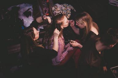 Keywords: model girl dress beauty dark background fashion style jacket female emotions long hair photoshoot table hairstyle hair posture sitting cosmetics hands