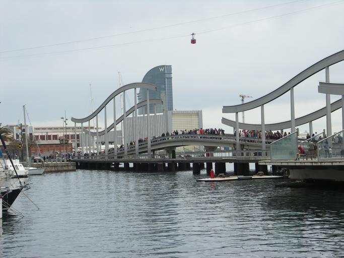 Keywords: modern bridge barcelona port of bridge river sea people marina
