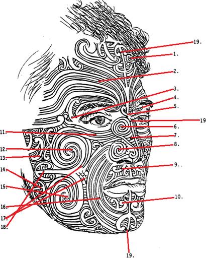 | Keywords: Moko zones.png en Moko nomenclature by Horatio Gordon Robley from http //nzetc victoria ac nz/tm/scholarly/tei-WalRobl-t1-body-d1-d7 html 1 Titi 2 Tiwahana 3 Pukaru 3a Kape 4 Rewha 5 Kohiti 6 Ngu 7 Whakatara 8 Pongiangia 9 Hupe 10 Kauae Kauwae 11 Kumikumi 12 Kowhiri Kowiri 13 Paepae 14 Putarinqa 15 Korowaha koroaha 16 Rerepehi 17 Wero 18 Kokiri 19 Waiora 1930-12-31 http //nzetc victoria ac nz/etexts/WalRobl/WalRobl107a jpg en Horatio Gordon Robley other versions PD-old-70-1923 Tā moko | ||||