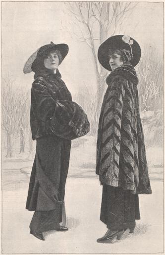 Keywords: Mole coat and cape, Revillon Freres, New York, 1914.jpg Fur Trade Review November 1914 On the left a smart coat of mole with elbow sleeves Collar and scuffs are trimmed with skunk The fancy moff is also of mole - The long mole cape on the right has the belted effect at the back Skunk forms the collar Published by coutesy of Messrs Revillon Freres New York Collection G C Franke 1914-11 author PD-old <gallery>Fur Trade Review November 1914 34 jpg</gallery> Fur Trade Review November 1914 Fur Trade Review November 1914 34 jpg Revillon Frères Mole clothing Muffs Fur capes |