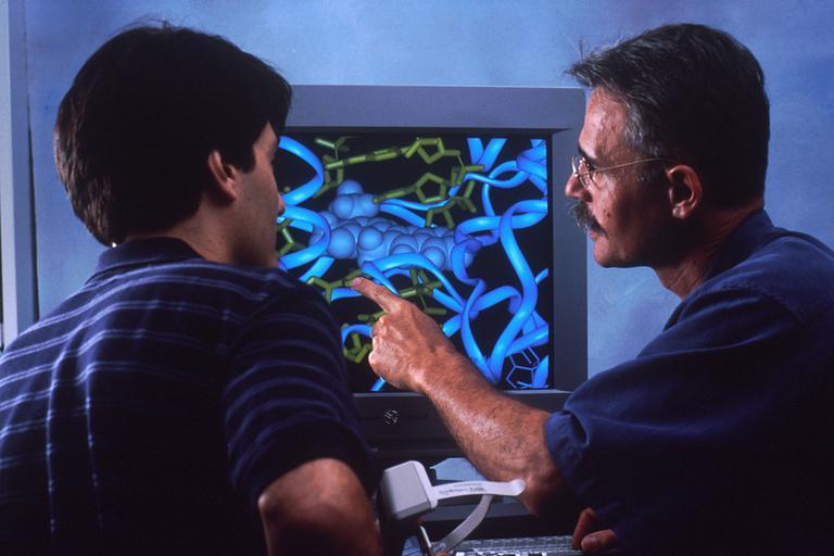 | Keywords: Molecular modeling.jpg  Two adult caucasian men sit in front of a computer that displays molecular modeling Topics/Categories People -- Adult Science and Technology -- Laboratory Techniques/Equipment Type Color Photo Source National Cancer Institute Dr Jason Kang Photographer 1845 2000-10 Reuse Restrictions None - This image is in the public domain and can be freely reused Please credit the source and/or author listed above Dr Jason Kang Photographer PD-USGov-HHS-NIH Media from National Cancer Institute Visuals Online Images uploaded by Fæ Molecular modelling People using computers in the 2000s Pointing at screens |