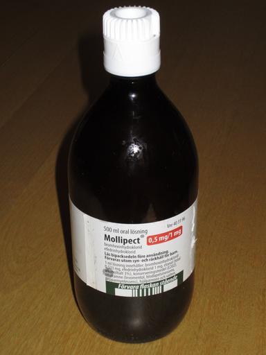 Keywords: Mollipect.JPG en A bottle of cough medicine Mollipect sv En flaska av hostmedicinen Mollipect own Xanor 2011-06-30 Cc-zero Glass vials Antitussives Combination drugs Brown bottles Medical drinks