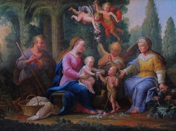 Keywords: Molsheim Jésuites255.JPG Alsace Bas-Rhin Molsheim Eglise des Jésuites Devant d'autel Peinture Sainte-Famille XVIIIe own 2013 Ralph Hammann cc-by-sa-3 0 Artwork / Œuvre d'art / Kunstwerk Artist Sainte Famille assise dans un paysage méridional avec architecture classsique recevant la visite du petit saint Jean en présence d'anges et de l'Agneau XVIIIe siècle oil canvas cm 71 206 Eglise des Jésuites Molsheim Autel secondaire de St-Jean-Baptiste PM67000533 IM67009667 object history other versions Ralph Hammann PD-old accession number Photographs of Molsheim by Ralph Hammann Taken with Canon PowerShot SX20 IS Autel de Saint-Jean Baptiste Molsheim Objets monuments historiques in Molsheim Objets monuments historiques in Bas-Rhin church paintings Baroque church paintings in Alsace 18th-century church paintings in Alsace 18th-century paintings of Holy Family Paintings of Holy Family with putti Paintings of putti in France 18th-century paintings of putti Textile antependia 18th-century antependia Baroque antependia
