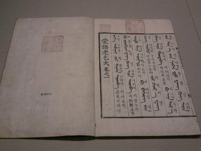 Keywords: Mongeonogeoldae in museum.jpg Mongeonogeoldae 蒙語 乞大/몽어노걸 first roll 卷之 displayed in Seoul National University Kyujanggak Institute for Koreanology Studies Text is witten in hanja hangeul and mongol bichig mongol writting that appear at Gengis Khan time Mongeonogeoldae 蒙語 乞大/몽어노걸 premier rouleau 卷之 affiché à l'Université nationale de Séoul Institut Kyujanggak pour les études coréennes Le texte est écrit en hanja hangeul et mmongol bichig écriture mongole apparue à l'époque de Gengis Khan 蒙語 乞大/몽어노걸 语和蒙语,卷之 14世代卷 蒙語 乞大/몽어노걸 卷之 2013-08-09 11 57 39 own Salamander724 Uploaded with UploadWizard Texts in Mongolian script Korean text Books from Korea Bilingual media |