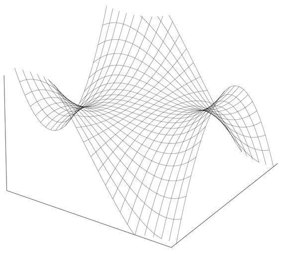 | Keywords: Monkey Saddle Surface (Mesh).png A monkey saddle surface with the equation<br> <math>z x 3-3xy 2 \ </math> Self-made done in MuPad 11/04/0206 Inductiveload Shaded Version saddle point Cubic surfaces Surface plots MuPAD Code This code is more complicated than necessary because is is a slightly altered version of code for a shaded mesh graph <pre> f x 3-3 x y 2 conts 16 projectionlevel -1 5 colourfunc zip RGB Red RGB CornflowerBlue a b -> f x y +1 / 2 a - f x y -1 / 2 b funcplot plot Function3d f x y x -1 1 y -1 1 Mesh 24 24 Submesh 8 8 LineColor RGB Black 0 99 LineWidth 0 1 Filled FALSE FillColorFunction colourfunc AxesTitleFont Courier New 14 ViewingBoxZRange -1 5 1 camera plot Camera 16 -24 30 0 0 -0 25 0 08 ploteverything plot Canvas funcplot Width 200 unit mm Height 150 unit mm Axes Frame TicksVisible FALSE TicksLabelsVisible FALSE AxesTitles camera </pre> |