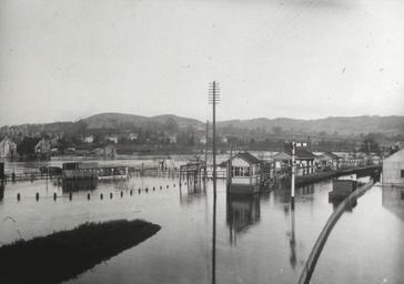 Keywords: 51 49N 2 42W Monmouth Mayhill railway station is a disused railway station. It was one of two stations that served the town of Monmouth, Wales. 4 August 1873 Opened. January 5, 1959 Closed. May Hill Station under Flood, probably in 1910, the Wye runs across middle. |