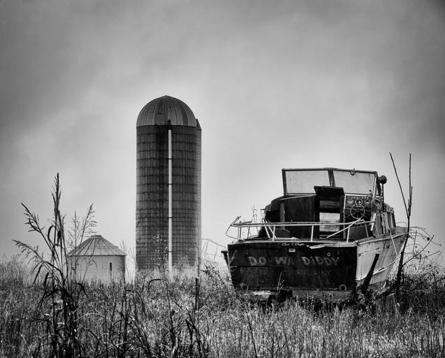 Keywords: monochrome black and white silo country rural boat architecture classic scenery america field grass scenic