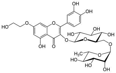 Keywords: Monoxerutin.svg en Monoxerutin; Varemoid; Rutilemone; Relvene; Troxerutin; Monohydroxyethylrutin own ; ISBN 978-3642009624; S 1124 Yikrazuul 2010-12-05 Quercetin glycosides Rutinosides
