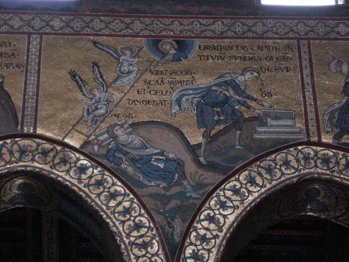 Keywords: Monreale-Jacob's staircase.jpg en Sleeping Jacob sees ladder from earth to Heaven Own Sibeaster 2008-07 Cathedral Monreale - Old Testament mosaics Jacob's ladder