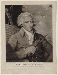 Keywords: Monsieur de Saint-George Ward Brown Angelo Meyer Gallica-color.jpg en Chevalier de Saint-George 1745-1799 from an Original Picture at Mr Angelo's Fencing Academy painted by Mather Brown 1761-1831 engraved by William Ward 1766-1826 Chevalier de Saint-George was one of the earliest musicians of African ancestry in the world of European classical music fr Portrait peint par Mather Brown 1761-1831 Gravé par William Ward 1766-1826 Chevalier de Saint-George 1745-1799 d'après une peinture originale à l'académie de Henry Angelo Joseph Bologne de Saint-George fut dans la seconde moitié du XVIIIème siècle européen l'un des premiers musiciens afridescendants Gallica http //catalogue bnf fr/ark /12148/cb39623772k Bibliothèque Nationale de France Notice FRBNF14793223 London Bradshaw n°4 Coventry street Mather Brown William Ward 1788 Monsieur de St-George jpg PD-old-100 Joseph Boulogne de Saint-George Homme de couleur libre Abolitionists 1788 in art William Ward engraver Mather Brown |