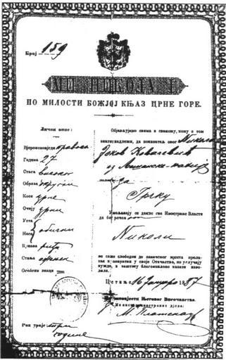 Keywords: Montenegro passport.jpg An old passport of Montenegro issued in 1887 during rule of prince Danilo Petrovic Njegos <table border 1> <tr><th>Serbian</th><th>English</th> <tr><td> Б ој 159 <center><h1> И ИКОЛА I</h1></center> <center><h2>ПО ИЛОСТИ БОЖЈОЈ КЊАЗ ЦР Е ГОРЕ </h2></center> <table> <tr><td valign top> Лични опис <br> Вје оисповеди п авосл<br> Година 27<br> Стаса високог<br> Об аза ок угли<br> Косе ц не<br> Очију ц ни<br> <table> <tr><td>Уста</td><td rowspan 2 valign center> обични</td></tr> <tr><td> оса</td></tr> </table> Б кова иђа<br> Стања ожењен<br> Особени знаци <br> <br> печат<br> <br> Рок т аје т и<br> године </td><td> Објављујемо свима и свакому кому о том<br> знати надлежи да показатељ овог икола<br> Јаков Ковачевић<br> од Љешанске нахије<br> <br> путује за<br> Г чку<br> <br> Умољавају се дакле све Иност ане Власти<br> да би еченом<br> иколи<br> <br> не само слободни до означеног мјеста п олазак<br> и пов атак у своје Отачаство но услучају<br> нужде и заштиту благонаклоно казати изволиле <br> <br> Ц е т и њ е 16 Јануа а 1887<br> <br> По заповести Његовог Височанства <br> иниста иност аних дјела <br> Пламенац </td></tr> </table> </td><td valign top> Number 159 <center> <h1>WE NIKOLA I</h1></center> <center><h2>BY THE GRACE OF GOD PRINCE OF MONTENEGRO </h2></center> <table> <tr valign top><td> Personal description <br> Faith orthod<br> Years 27<br> Stature tall<br> Face round<br> Hair black<br> Eyes black<br> <table> <tr><td>Mouth</td><td rowspan 2 valign center> ordinary</td></tr> <tr><td>Nose</td></tr> </table> Moustache brown<br> State married<br> Personal marks <br> <br> stamp<br> <br> Lasts for three<br> years </td><td> Announce to all and everyone who about it<br> is entitled to know that wearer of this Nikola<br> Jakov Kovačević<br> of Lješanska Nahija<br> <br> travels to<br> Greece<br> <br> Asked is so of all Foreign Governments that<br> to said <br> Nikola<br> <br> not only free to stated place passage<br> and return to his Fatherland but in case<br> of necessity protection as well to give <br> <br> Cetinje 16 January 1887<br> <br> By command of His Highness <br> Minister of foreign affairs <br> M Plamenac </td></tr> </table> </td></tr> </table> njegos org PD-Art GFDL relicense Passports of Montenegro Artworks missing infobox template |