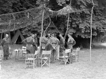 | Keywords: Monty and Simonds.jpg General Sir Bernard Montgomery eighth from left talking with Lieutenant-General Guy Simonds ninth from left and other senior officers of the 2nd Canadian Corps at Corps Headquarters in the Normandy bridgehead France 20 July 1944 Per original source Library and Archives Canada reference http //mikan3 archives ca/pam/public_mikan/index php fuseaction genitem displayItem lang eng rec_nbr 3219181 rec_nbr_list 3222239 3220485 3220484 3220483 3220482 3219185 3219184 3219183 3219181 3215971 tmplt_nbr 201 item_index 1 total_items 1 PA-116515 2007-05-12 War photographer Lieut Donald I Grant / Dept of National Defence Canada Copyright expired no restrictions on use; public domain per information on photo at LAC Bernard Montgomery Guy Simonds Black and white photographs of war Historical photographs Canadian Army in World War II soldiers nets standing men Canada in World War II in 1944 Battle of Verrières Ridge PD-old 1944-07-20 |