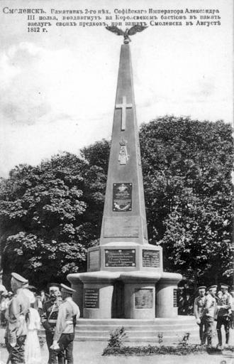 | Keywords: Monument to Sofia Regiment 2.jpg en Monument to Sofia Regiment View from the memorial plaques in the Soviet era were destroyed now restored ru Памятник Софийскому полку Вид с памятными досками в годы советской власти были уничтожены сейчас восстанавливаются О игинальная отк ытка е установлены before 1917 года PD-RusEmpire 20th-century postcards Postcards of Smolensk Historical photos of Monument to Sofijsky regiment | ||||