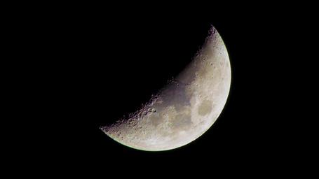 Keywords: moon color quarter lunar black background minimalism texture Moonshot (during clear dry night) - NOT at zenithal position but 45° Unfiltered canon EF 100-400 f5.6 L lens Crop factor : eqv 640mm No stabilization - No corrections - Tripod mount Enhanced color to show the chroma aberration WB 4300K (and green-magenta balanced) Very slight NR The ugly sharpness comes from flickr upload Note : I usually leave an Hoya filter on the lens, but the chroma aberration is much bigger and the crispness is utterly lost (half less) Geographical note : on the edge of the crescent shadow is the Mare Serenitatis and Mare Tranquillitatis. The enhanced saturation show the "more blueish" tan of Mare Tranquillitatis which is not a chroma aberration. Moonshot (during clear dry night) - NOT at zenithal position but 45° Unfiltered canon EF 100-400 f5.6 L lens Crop factor : eqv 640mm No stabilization - No corrections - Tripod mount Enhanced color to show the chroma aberration WB 4300K (and green-magenta balanced) Very slight NR The ugly sharpness comes from flickr upload Note : I usually leave an Hoya filter on the lens, but the chroma aberration is much bigger and the crispness is utterly lost (half less) Geographical note : on the edge of the crescent shadow is the Mare Serenitatis and Mare Tranquillitatis. The enhanced saturation show the "more blueish" tan of Mare Tranquillitatis which is not a chroma aberration.