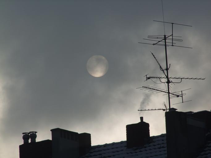 Keywords: moon full moon roof tile sky mood atmosphere mysticism mystical romantic night sky mysterious night romance abendstimmung evening sky antenna lighting smoke clouds out of date technology