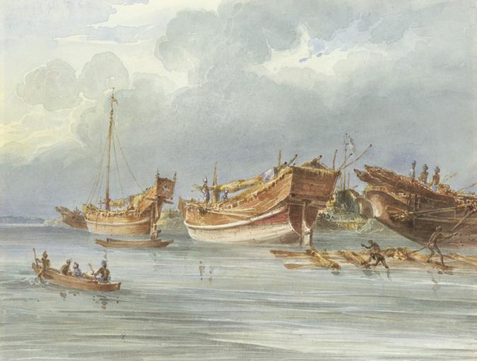 | Keywords: Moored boats from Arakan or Chittagong.jpg Watercolour by Thomas Prinsep 1800-1830 of moored boats from Arakan or Chittagong dated c 1828 The image is inscribed on the album page 'Mugh boats' Mugh is the name commonly applied to natives of Arakan or Chittagong Thomas Prinsep came from a family who served in India for three generations; five of his brothers were also in the country Thomas was in charge of the surveying of the Sunderbunds; a large area of fresh and saltwater mangrove swamp in Bengal covering sixty to eighty miles and consisting of flat marshy islands covered with dense forests inhabited by crocodiles and forming the final retreat of the Bengal Tiger He made a detailed survey of the area and his maps of the 24 Parganas District formed part of the Hodges map of the Sunderbunds published in 1831 The limits of the Sunderbunds forest is known as 'The Princeps Line' Thomas was sent to Chittagong in 1826 http //www bl uk/onlinegallery/onlineex/apac/other/largeimage68389 html British Library website Thomas Prinsep 1800-1830 PD-old-100 Port of Chittagong 1828 paintings Watercolor paintings of landscapes Paintings of ships Rakhine State Paintings of ports and harbours Old vintage photographs of Bangladesh |