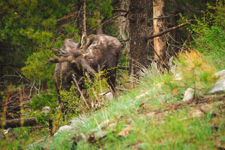 Keywords: moose calf young animal wildlife nature forest trees environment brown mammal woods